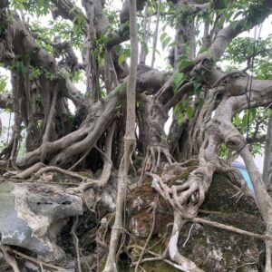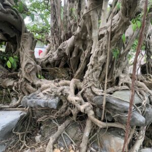 - Cây mang một dáng vẻ bề thế, gân guốc, mạnh mẽ, vững chãi hiên ngang kinh qua bao biến cố của thời gian và thiên nhiên vẫn xanh tốt, bất chấp mọi phong ba bão táp. Bệ rễ cổ thụ, xù xì, gân guốc phủ rộng toàn diện tích chậu trồng, cành tán rất xum xuê, nhiều cành tán phân bố rết dều, tạo nên sự phong sương, dày dạn của một cây cố thụ đích thực.