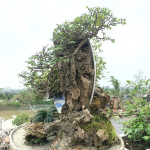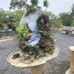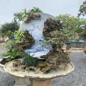 - Từ chất liệu gốm, đá thấm thủy và các loại cây bonsai đẹp như: Cây Sung, Cây Sơn Liễu, cây Si, cây Trúc và các loại cỏ. Cùng với bàn tay tài hoa, đôi tay khéo léo, mắt cách sắp xếp bố cục hài hòa của nghệ nhân đã giúp tác phẩm có chiều sâu và diễn tả mang được cả thiên nhiên hùng vĩ hoang sơ và trong tác phẩm